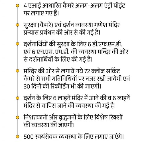 मोती डूंगरी गणेश जन्मोत्सव में श्रद्धालुओं की सुरक्षा और व्यवस्था के लिए इस बार एआई आधारित हाई-टेक सिस्टम लगाया गया है। मंदिर प्रशासन ने बताया कि चार एआई कैमरे अलग-अलग एंट्री पॉइंट्स पर लगाए गए हैं। इन कैमरों के माध्यम से न सिर्फ निगरानी की जाएगी, बल्कि मंदिर में आने वाले श्रद्धालुओं की सटीक गिनती भी संभव होगी।