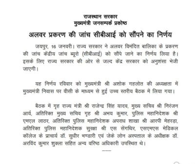 संवेदनशील मुख्यमंत्री गहलोत का बड़ा फैसला, अलवर में मूक बधिर बच्ची से ज्यादती प्रकरण की जांच सीबीआई को सौंपने की तैयारी, प्रदेश की गहलोत जल्द ही इसके लिए करेगी केंद्र से सिफारिश, गौरतलब है कि भाजपा प्रदेशाध्यक्ष पूनिया की मांग पर गहलोत ने किया था ट्वीट, लिखा था यदि पीड़िता का परिवार चाहेगा, तो मामले की जांच सीआईडी या सीबीआई या किसी भी स्वतंत्र एजेंसी से करवाने को हम हैं तैयार, इधर अलवर एसपी ने भी अपने बयानों पर यू टर्न लेते हुए कहा कि दुष्कर्म की आशंका से इनकार नहीं किया गया है,