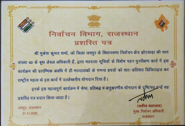 झोटवाड़ा विधानसभा क्षेत्र के भाग संख्या 40 के बीएलओ मुकेश शर्मा इस अभियान का सच्चा स्वरूप प्रस्तुत करते हैं। उनके क्षेत्र में लगभग 100 ढ़ाणियां हैं, जो खेतों में दूर-दूर बसी हुई हैं। इन ढाणियों तक पहुंचना आसान नहीं, फिर भी मुकेश शर्मा ने घर-घर पैदल जाकर एसआईआर का शत-प्रतिशत कार्य 18 नवंबर तक पूरा कर लिया।