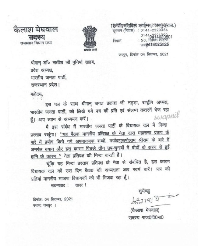भाजपा प्रदेशाध्‍यक्ष को लिखे अपने 10पेज के लेटर में पूर्व विधानसभा अध्‍यक्ष कैलाश मेघवाल ने पूर्व ग्रह मंत्री लालचंद कटारिया पर पद और टिकट बांटने में पैसों के गंभीर आरोप लगाए हैं। मेघवाल ने कटारिया पर महाराणा प्रताप और भगवान राम के अपमान का आरोप भी लगाया है। साथ ही मेघवाल ने लिखा कि कटारिया के बयानों से पार्टी को चुनावों में भारी नुकसान का सामना करना पड़ा है। मेघवाल ने पत्र के साथ राष्ट्रीय अध्यक्ष जेपी नड्डा को भेजी शिकायतों की प्रति भी भेजी है। साथ ही लेटर के बाद से ही मेघवाल ने मीडिया से दूरी बना ली है।