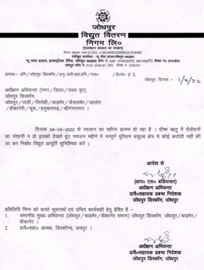जयपुर-जोधपुर डिस्कॉम ने 1अप्रेल 2022 को निकाला था आदेश