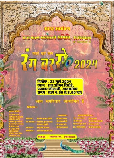 जयपुर। होली के मौके पर राज आंगन रिसोर्ट, पत्रकार कॉलोनी मानसरोवर जयपुर में शनिवार को “रंग बरसे-2024” फाग महोत्सव आयोजित किया जा रहा है। आयोजन के सह संयोजक विवेक गोयल ने बताया कि प्रदेशभर में फाग महोत्सव की धूम है इसी कड़ी में जयपुर में भी ब्रज फाग महोत्सव समिति, राजस्थान की ओर से फाग महोत्सव का आयोजन किया जा रहा है।