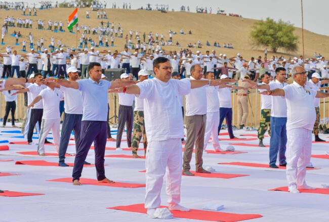 जैसलमेर, (dusrikhabar.com)। मुख्यमंत्री भजनलाल शर्मा ने शनिवार को 11वें अंतर्राष्ट्रीय योग दिवस के अवसर पर जैसलमेर के खुड़ी के रेतीले धोरों पर राज्य स्तरीय कार्यक्रम में योगाभ्यास किया। इस अवसर पर उन्होंने प्रधानमंत्री नरेन्द्र मोदी द्वारा विशाखापटनम से दिए गए संबोधन का श्रवण भी किया।