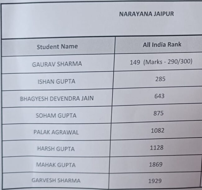 इस अवसर पर संस्थान के शिक्षकों ने कहा कि उच्च गुणवत्ता वाली शिक्षा, व्यक्तिगत मार्गदर्शन और परिणामोन्मुख तैयारी ही नारायणा की सफलता का मूल आधार है।