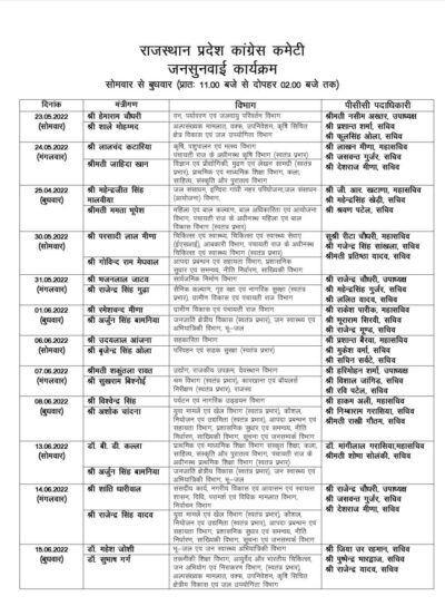 जयपुर। प्रदेश कांग्रेस कार्यालय कमेटी के अध्यक्ष गोविंद सिंह डोटासरा के निर्देशानुसार मंत्रिमंडल के सदस्यों का जनसुनवाई कार्यक्रम जारी कर दिया गया है। 23मई से शुरू होने वाली जनसुनवाई में अलग-अलग मंत्री लोगों की जनसस्याएं सुनेंगे। 23मई से शुरु होकर यह आयोजन 15जुलाई तक चलेगा।
